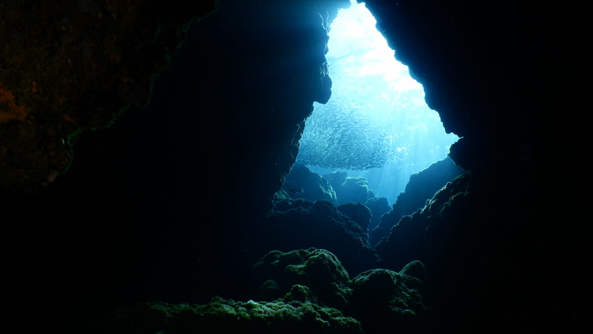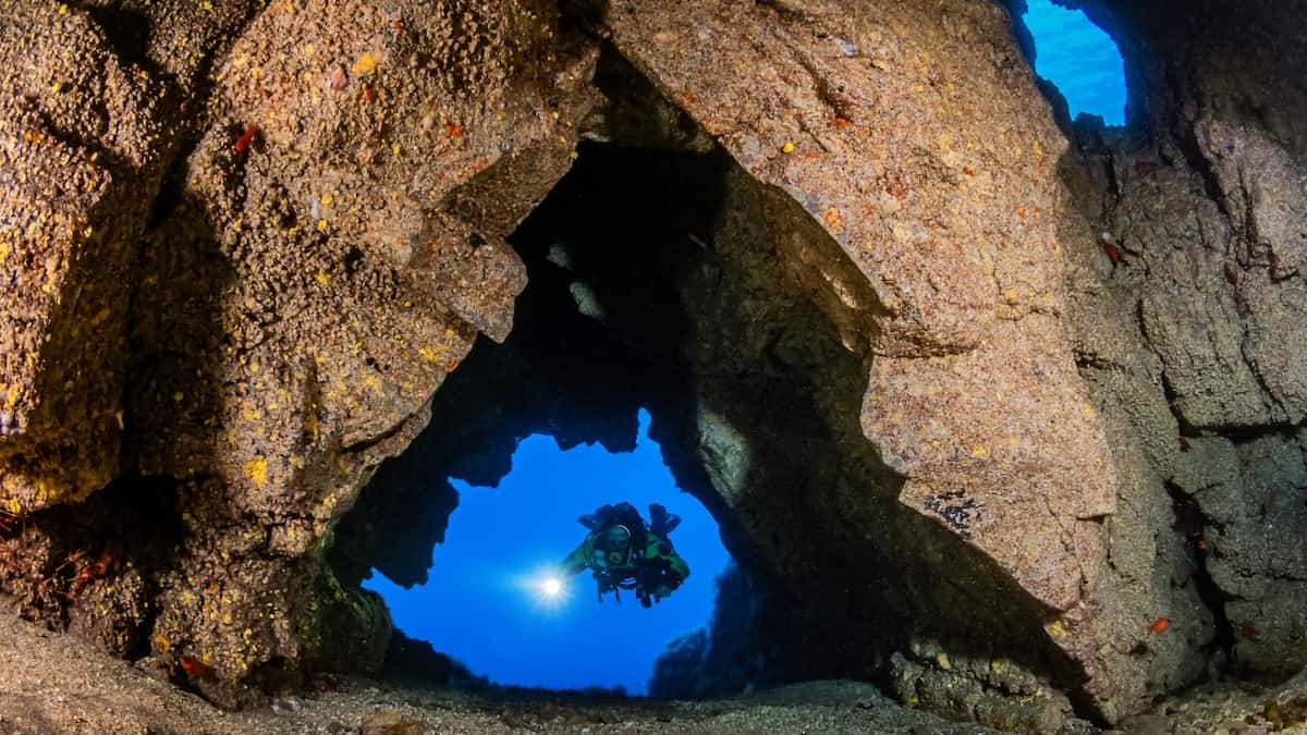 Al caer sobre el fondo marino, la lava creó un paisaje único. Columnas, cuevas, crestas y túneles que se extienden a más de 350 m de profundidad.