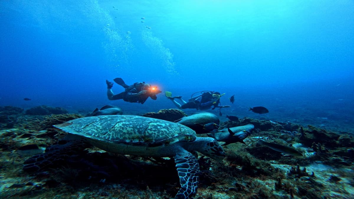 Es muy posible que los chuchos, rayas o las tortugas bobas naden a tu alrededor. O que te veas rodeado por enormes bancos de peces.